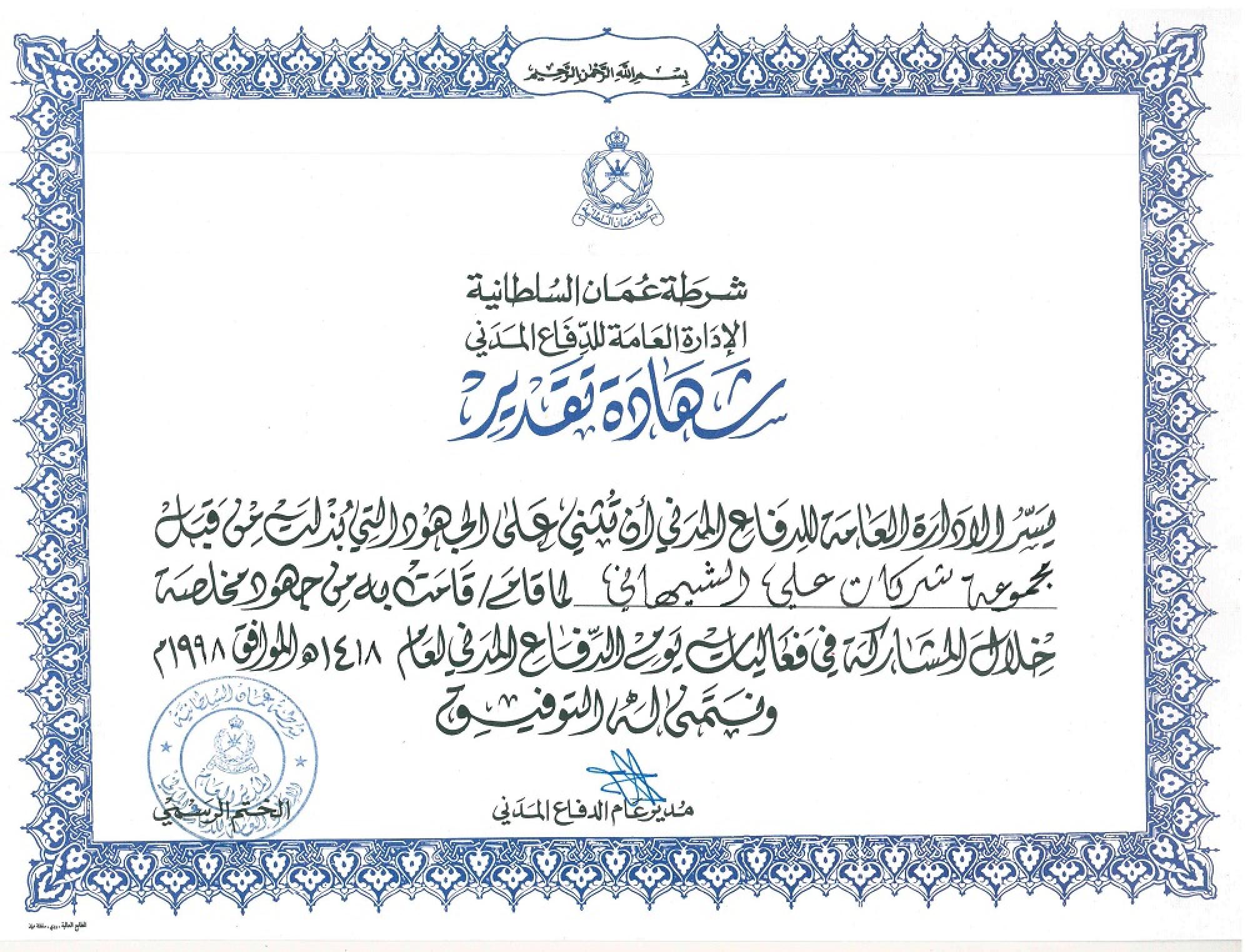 Certificate of Appreciation - Civil Defence ROP