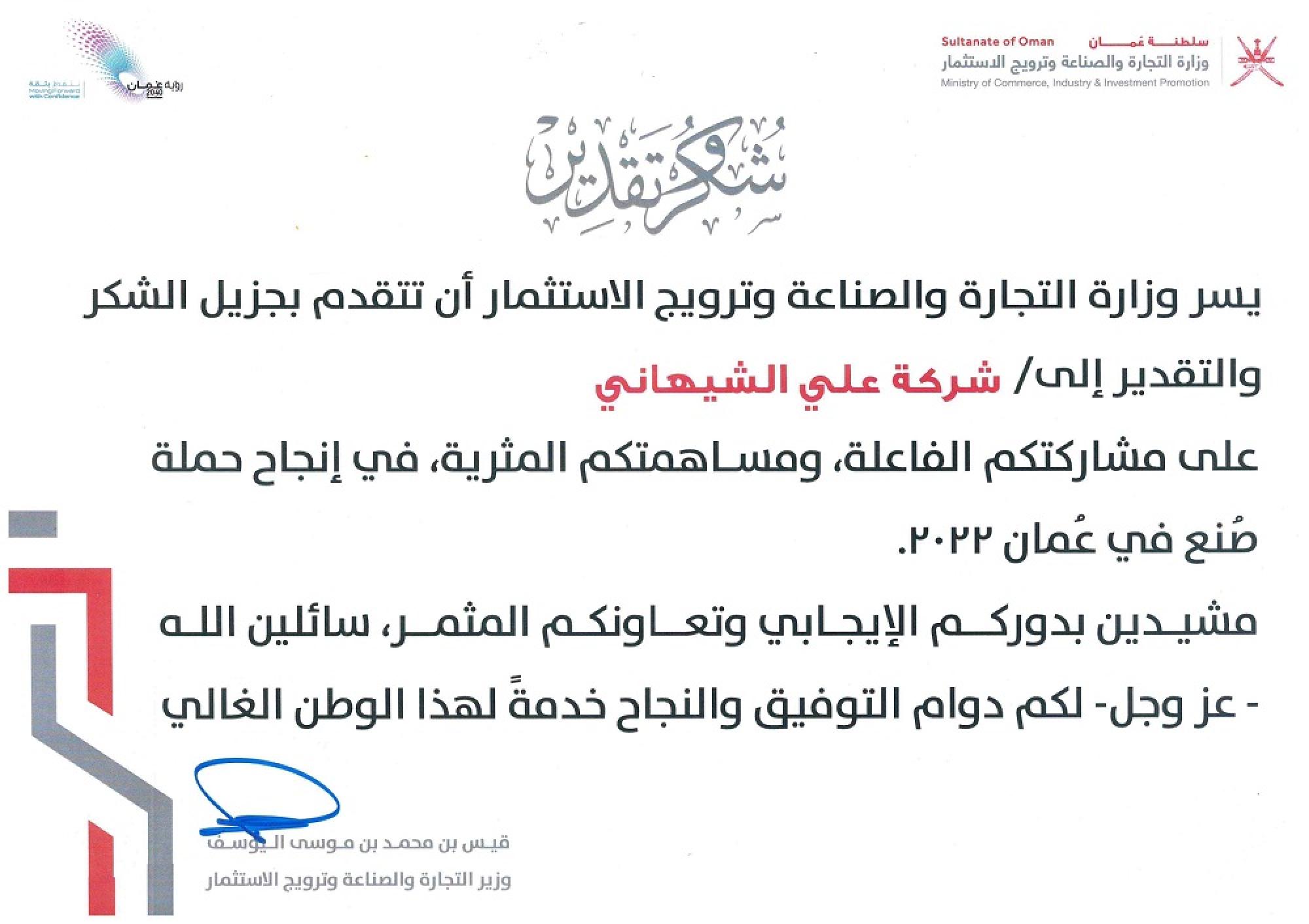 Certificate of Appreciation Ministry of Commerce and Industry Made in Oman Camp